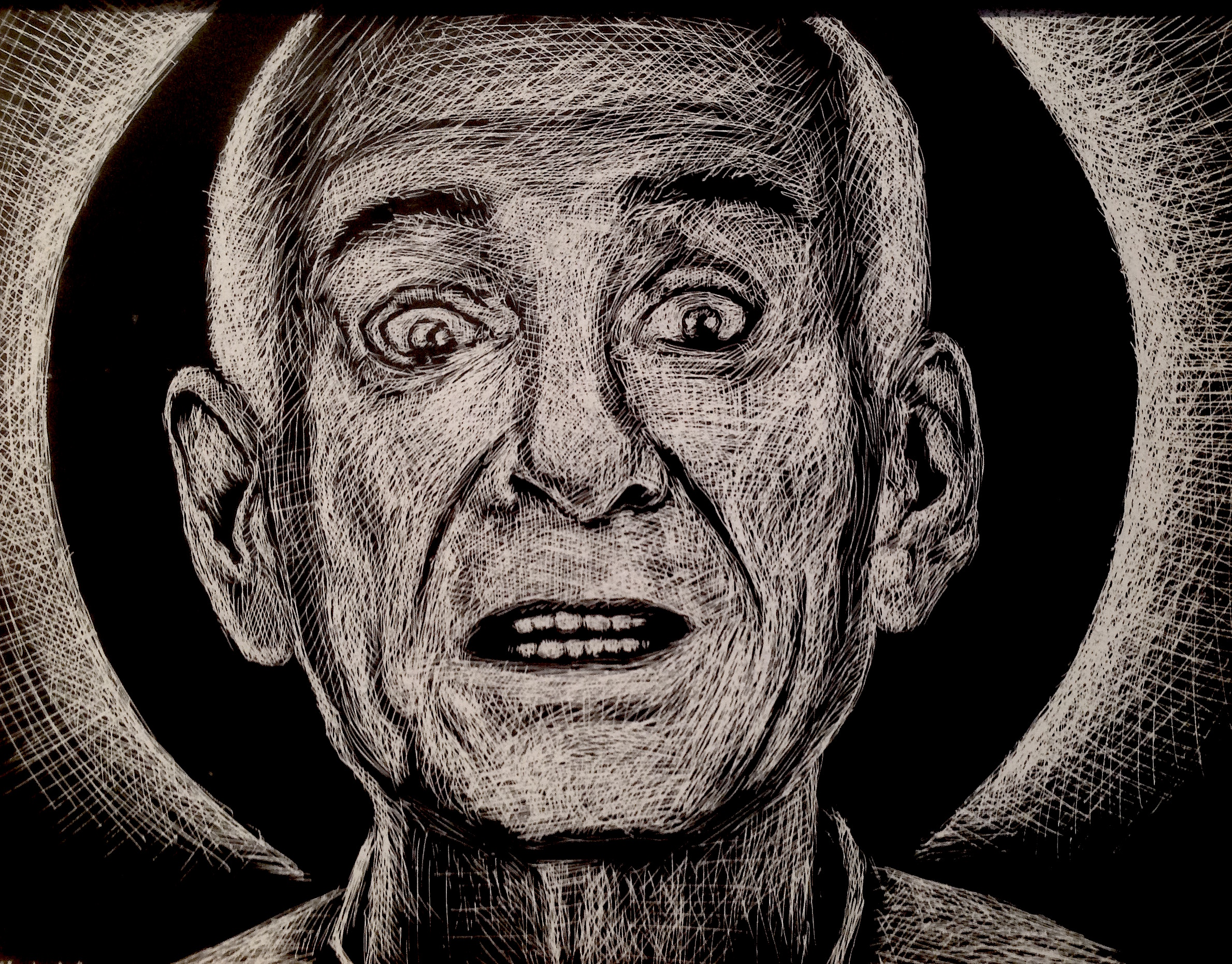 Diverse multimedia artist R.K. Shuquem has immersed himself in the challenge of creating 50 original 6" x 6" art panels in 50 days, an ambitious undertaking begun on June 8, 2015. He will be debuting the full set of 50 pieces at Blue Moon 2015 on Friday, July 31st at LAST Projects in Hollywood. For the series of 50 panels, Shuquem explores the theme of "jail cells" as contemplated through psychological and spiritual perspectives, crafting bleak yet mystically evocative black-and-white pieces from India ink on 6" x 6" panels.Blue Moon 2015 also offers a chance to see the full set of four 5.5’ x 5’ Pantocon album covers Shuquem recently completed for his multimedia Medieval Crimes project. The pieces, entitled Earth, Air, Fire and Water serve as the initial stages of the project which will eventually culminate in the formation of the dystopian black metal band Pantocon.